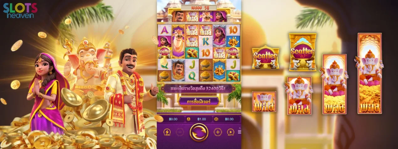 มาถึงส่วนสำคัญที่ไม่พูดถึงไม่ได้เลย นั่นก็คือเหล่าสัญลักษณ์ต่าง ๆ ในเกมค่ะ สัญลักษณ์ที่ให้มูลค่าสูงสุดคือ สัญลักษณ์วัว ที่ให้รางวัลถึง 80 เท่าเมื่อได้ 6 ตัว ส่วนสัญลักษณ์ WILD หรือรูปพระพิฆเนศจะใช้แทนสัญลักษณ์อื่น ๆ ได้หมด ยกเว้นเพียงสัญลักษณ์ Scatter เท่านั้น แถมยังปรากฏได้ทุกรีลยกเว้นรีลแรก ทำให้การเชื่อมสัญลักษณ์เพื่อรับรางวัลเป็นเรื่องง่าย และยังมีสัญลักษณ์อื่น ๆ อย่างชายหนุ่มและหญิงสาวในชุดอินเดีย รวมถึงสัญลักษณ์อื่น ๆ ที่ให้รางวัลลดหลั่นกันไป ใครที่ได้ฟรีสปินแล้วเจอกับสัญลักษณ์เหล่านี้เยอะ ๆ บอกเลยว่าฟีเจอร์ตัวคูณจะทำเงินให้แบบไม่น่าเชื่อเลยทีเดียว