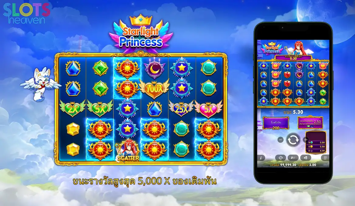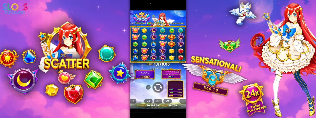 โฉมหน้าเกมสล็อต Starlight Princess™ มาในสไตล์อนิเมะแฟนตาซีที่ชวนให้ผู้เล่นรู้สึกเหมือนกำลังหลุดเข้าไปอยู่ในโลกการ์ตูนเทพธิดาพลังจักรวาลที่มีตัวละครหลักคือ เจ้าหญิง Starlight ถือคทาดาว พร้อมใช้พลังแสงมอบตัวคูณพิเศษให้ผู้เล่น ลุคคล้าย ๆ Sailor Moon บรรยากาศเกมแต่งแต้มด้วยความสดใสและกลิ่นอายมหัศจรรย์เต็มรูปแบบ ฉากหลังคือท้องฟ้าที่เต็มไปด้วยก้อนเมฆและปราสาทลอยฟ้า ขณะที่สัญลักษณ์ในเกมสะท้อนพลังเวทมนตร์ผ่านพระอาทิตย์ ดวงจันทร์ ดาว หัวใจ และอัญมณีหลากสี เสริมด้วยเพลงประกอบแนวอนิเมะญี่ปุ่นที่เต็มไปด้วยความรู้สึกเร้าใจเหมือนอยู่ในโลกเหนือจินตนาการจริง ๆ